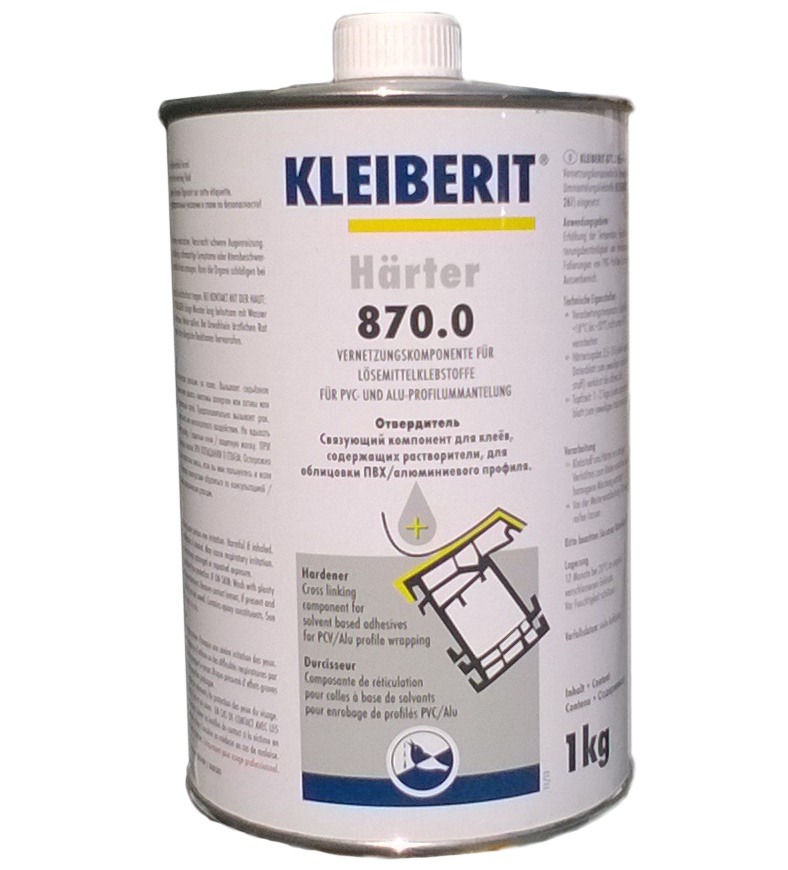 KLEIBERIT 870.0 - отвердитель для содержащих растворители клеев, таких как KLEIBERIT 257.7; 261.9. Количество добавляемого отвердителя может сильно варьироваться, обратите внимание на технический лист к используемому клею.
