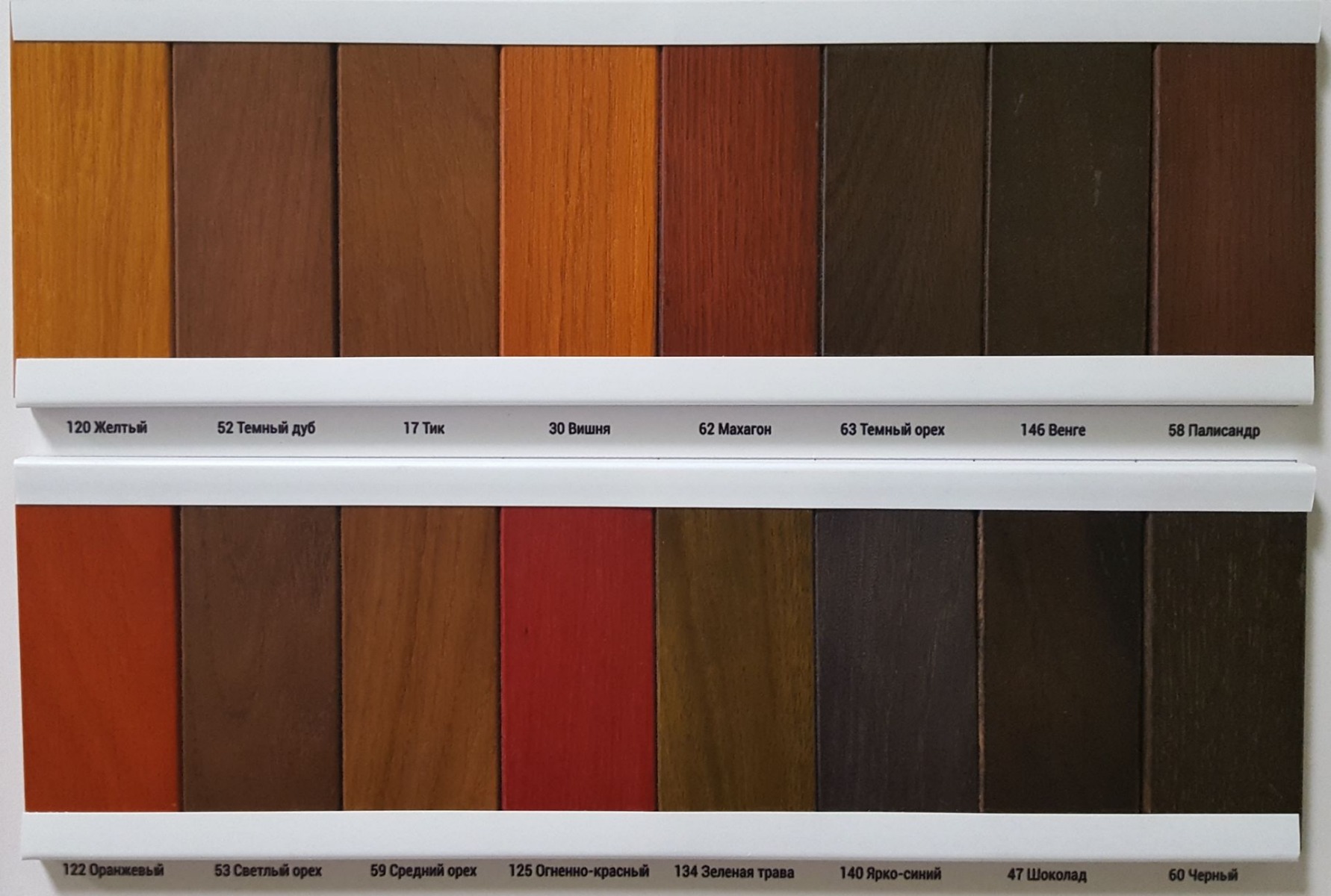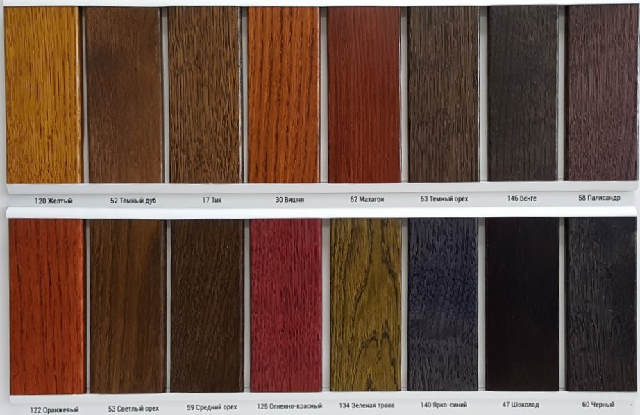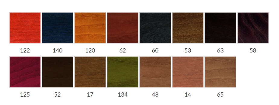 Черный, зеленый, красный, розовое дерево, мохагон, желтый, синий, светлый орех, темный орех, оранжевый и дуб.